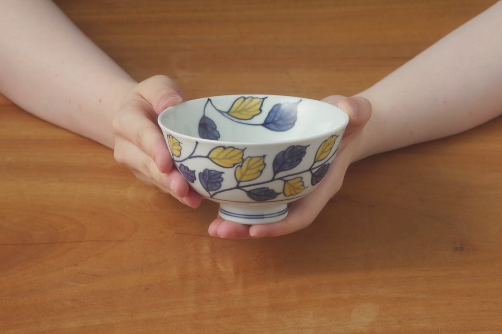 落ち着いた染付に、鮮やかな黄色の絵付けがアクセントになっている飯碗です。